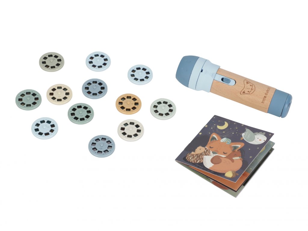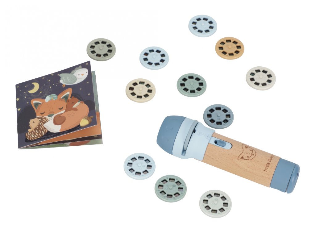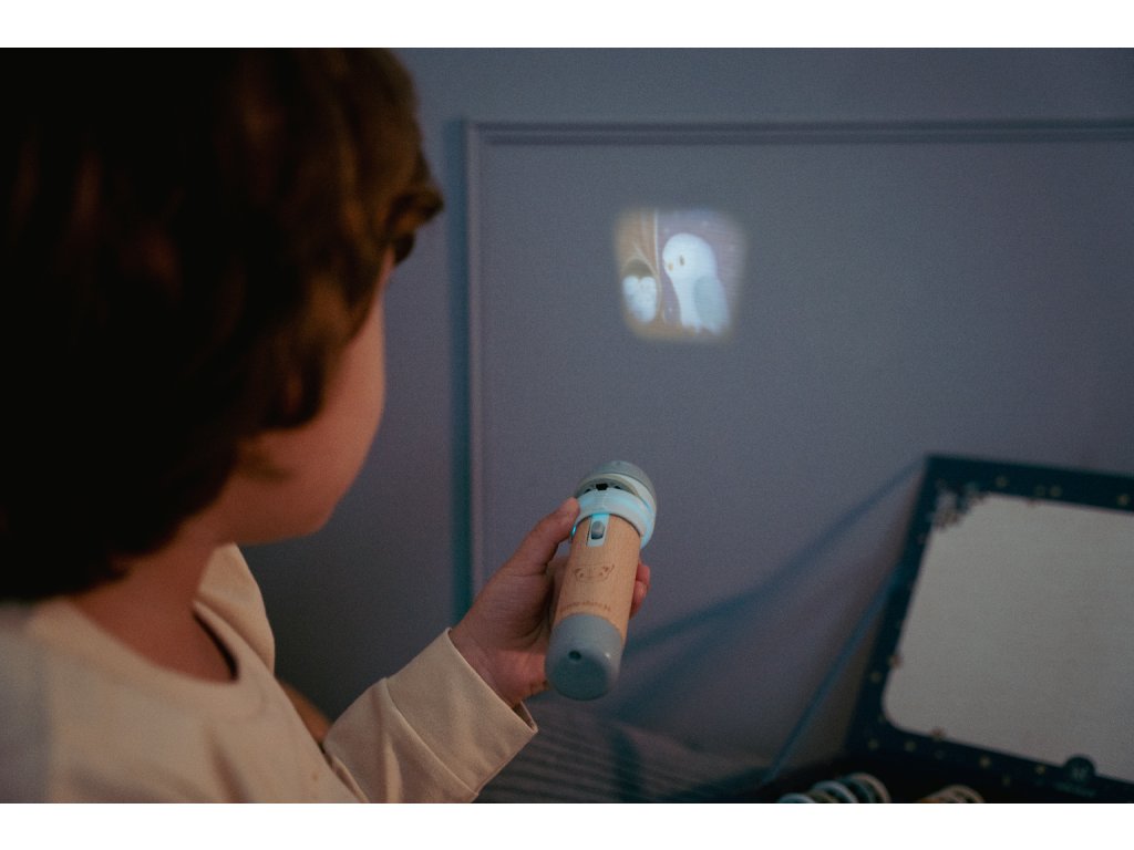 Projektor má pevnú drevenú rukoväť a funguje na batérie, takže si ho deti môžu vziať kamkoľvek so sebou. Po skončení príbehu je možné baterku aj všetko príslušenstvo ľahko uložiť do krásneho úložného boxu. Ideálny pre upokojujúci rituál pred spaním alebo príjemné spoločné chvíle.