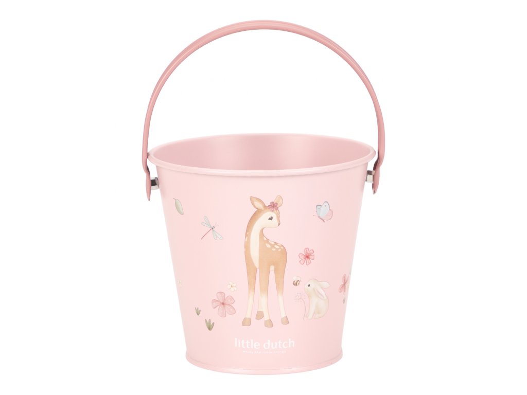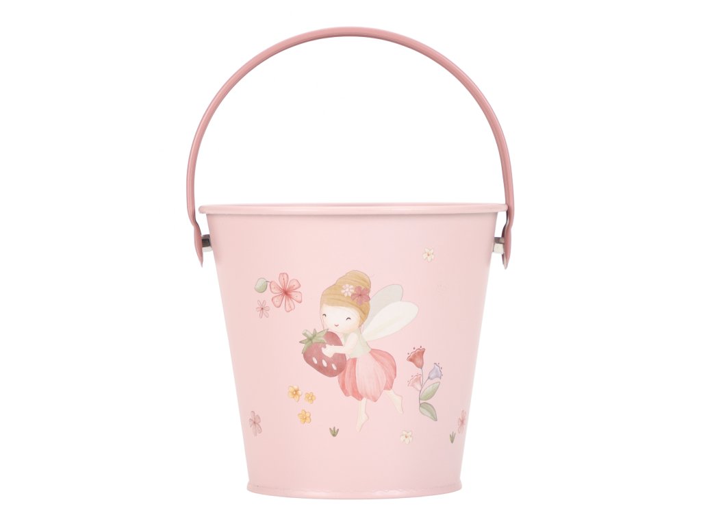 Kovové vedierko s nežnou potlačou a praktickou rukoväťou, ideálne na záhradné hry a prenášanie drobností.